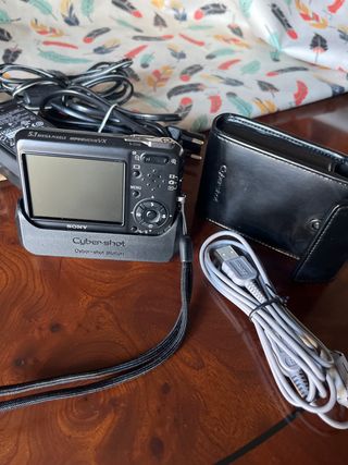 Cámara digital Sony Cyber-shot con una resolución de 5.1 megapíxeles. Incluye su estación de carga y accesorios. - Cámara digital Sony Cyber-shot - Resolución de 5.1 megapíxeles - Incluye estación de carga - Cable USB incluido - Funda protectora de cuero