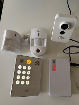 Kit de alarma con cámara y sensores. - Incluye : - Dos sensores de movimiento. - 2 Cámara de seguridad. - Panel de control y teclado numérico lo regalo ( última fotografía del anuncio) Ideal para completar tu kit de seguridad No tengo caja ni instrucciones Entrega en mano