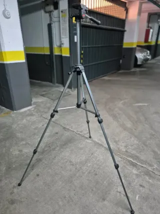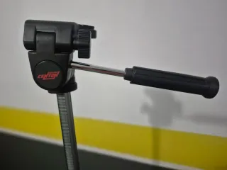 Trípode metálico para cámaras fotográficas o de vídeo. Es ligero y fácil de transportar. - Patas ajustables en altura. - Cabezal con movimiento. - Base estable.