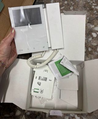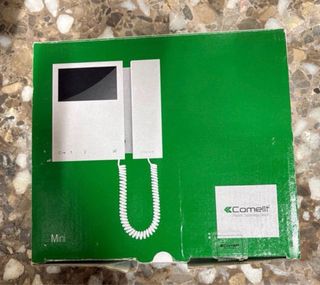 Videoportero Comelit modelo Mini. - Diseño compacto y moderno. - Panel frontal blanco con pantalla. - Auricular blanco con cable en espiral.