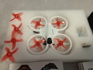 Drone EMAX EZ Pilot para carreras FPV. -Con cámara incorporada. -Mando a distancia. - Incluye gafas de visión. - Batería de 3.8V - 450 mAH. - Hélices rojas de repuesto. - Pegatinas decorativas sin todavía haberlas pegado.