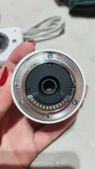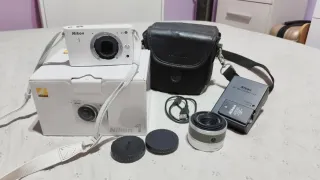 Se vende cámara Nikon 1 en color blanco, junto con sus accesorios. - Cuerpo de cámara Nikon 1. - Objetivo. - Cargador de batería. - Batería. - Funda de transporte. - Tapa de objetivo. El enganche del objetivo está roto...no se puede usar sin el objetivo, solo para gente que tenga el objetivo y se le haya roto la cámara o quiera arreglar el objetivo y usarla.