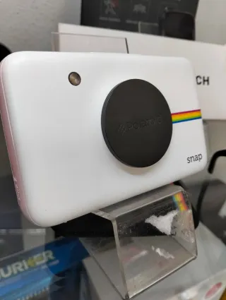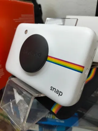 Cámara instantánea Polaroid Snap en color blanco. Compacta y fácil de usar. - Diseño moderno y ligero. - Lente circular negra con logo de Polaroid. - Tira de colores característica de la marca.