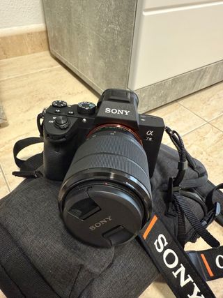 Cámara mirrorless Sony Alpha A7 III con objetivo. - Cuerpo de cámara negro. - Objetivo con tapa. - Correa para el cuello. - Bolsa de transporte.