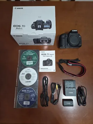 Se vende cámara Canon EOS 7D Mark II junto con sus accesorios originales. - Cuerpo de cámara Canon EOS 7D Mark II. - Caja original. - Manuales y CDs de software. - Cargador de batería. - Batería. - Correa para el cuello. - Objetivo canon 24-105mm 1:4 l IS USM - Parasol canon EW-83H - Filtro UV 77mm - Bolsa transporte cullmann - 2 tarjetas de memoria de 4gb y 15mb/s - 30mg/s - 1 tarjeta de memoria 32gb y 120 mb/s