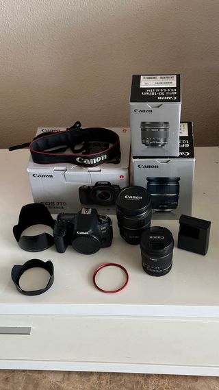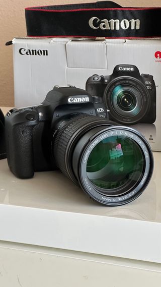 Canon EOS 77D (cuerpo) • 🔍 Canon EF-S 17-55mm f/2.8 IS USM — objetivo luminoso, calidad profesional • 🌄 Canon EF-S 10-18mm f/4.5-5.6 IS STM — ultra gran angular, perfecto para paisajes e interiores • Correa Canon original • Cargador Canon original+bateria • Tapas, parasoles, filtro y accesorios • Cajas originales de la cámara y de los objetivos Todo en estado impecable, listo para usar. Acepto prueba en mano. Se vende como conjunto.