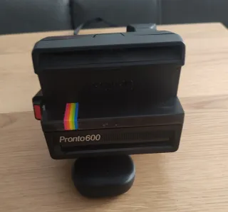 Cámara instantánea clásica Polaroid Pronto 600. - Diseño icónico. - Símbolo de arcoíris de Polaroid.