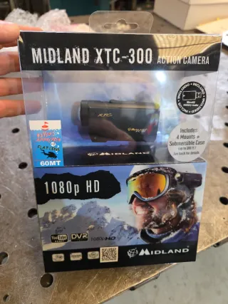 Cámara de acción Midland XTC-300 con resolución 1080p HD. A estrenar. Guardada, fue un regalo. La batería funciona y además son baratas de comprar porque son desmontables. - Incluye 4 soportes y funda sumergible (hasta 60 metros). - Lente plana. - Aprobada para buceo.