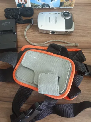 Cámara digital compacta Fujifilm FinePix xp-20 completa con caja cargador original ,batería, tarjeta. También incluye arnés para poner en pecho y grabar tus aventuras con ella Funciona perfectamente 14 MEGA pixel Sólo falta la tapita donde va la batería no afecta para nada se puede usar así
