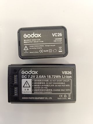 Se vende conjunto de batería y cargador para equipos fotográficos. - Batería VB26 de Li-ion, 7.2V, 2.6Ah, 18.72Wh. - Cargador VC26 USB. - Entrada del cargador: DC5V 2.0A. - Salida del cargador: DC8.4V 0.9A. - Fabricado en China.