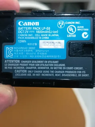Pack de dos baterías originales Canon LP-E6. - Voltaje: DC 7.2V - Capacidad: 1800mAh (Li-ion) - Energía: 13Wh - Fabricadas en Japón, ensambladas en China.