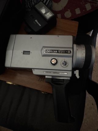 Cámara de video vintage Cosina Súper 8 en color plata. Un clásico para capturar tus recuerdos. - Diseño retro. - Cuerpo metálico. Vintage Camara de video de epoca Com su maletin y un flash .