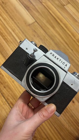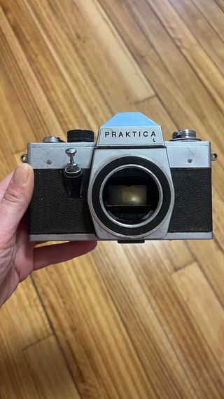 Cámara fotográfica clásica Praktica L. - Cuerpo en color plata y negro. - Diseño vintage.