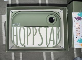 Cámara instantánea Hoppstar en color verde, con un diseño moderno y divertido. - Incluye la palabra artist impresa. - Detalle de HOPPSTAR en grande en la parte frontal. - Lente de cámara visible.
