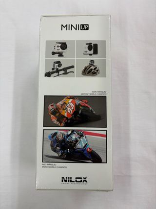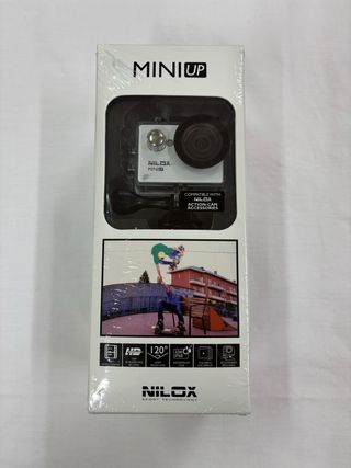 Cámara de acción Nilox Mini Up, perfecta para capturar tus aventuras. - Lente gran angular de 120°. - Sumergible hasta 30 metros (IP68). - Pantalla LCD a color. - Incluye accesorios.