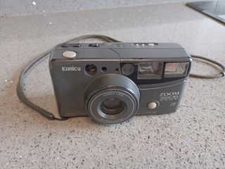 Cámara Konica Zoom FR70 en color gris oscuro. Presenta un aspecto ligeramente usado, pero en general está en buen estado. - Incluye correa para el cuello. - Lente Konica de 38-70mm. - Funciona con pilas 123 (no incluidas).