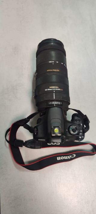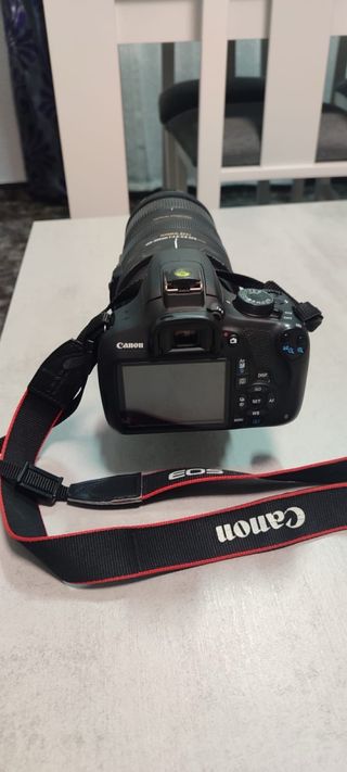 Cámara réflex digital Canon 1200D con su correa original. en muy buen estado, con objetivo sigma 120-400mm 1:4.5-5.6 DG APO HSM. objetivo con estabilizador óptico de imagen, ideal para fotografía. - Correa negra con detalles en rojo y logo EOS y Canon en blanco.