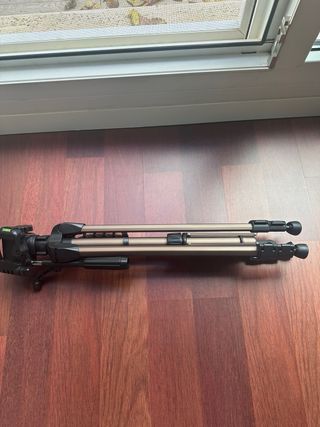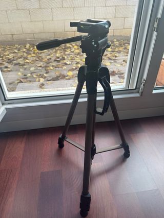 Trípode de cámara plateado y negro, ideal para fotografía y vídeo. - Patas ajustables - Cabezal giratorio. - Gancho para contrapeso.