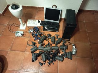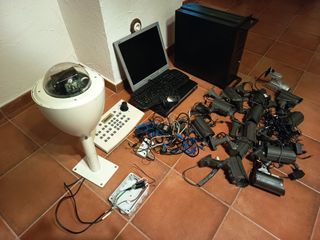 Conjunto de elementos para un sistema de seguridad CCTV. - Cámara domo con carcasa. - Mando controlador. - Múltiples cámaras de seguridad adicionales. - Caja de conexiones. - Ordenador portátil. - Torre de ordenador. - Cables y adaptadores varios.