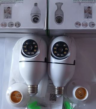 Se venden dos cámaras de seguridad IP con conexión WiFi, diseñadas con forma de bombilla E27. Ideales para vigilancia. - Pack de 2 unidades. - Conexión WiFi. - Diseño tipo bombilla E27.
