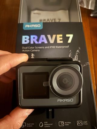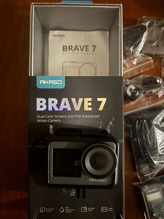 Cámara de acción AKASO BRAVE 7 LE con doble pantalla y resistencia al agua IPX8. - Grabación de video 4K a 30fps. - Captura de fotos de 20MP. - Pantallas duales a color. - Sumergible hasta 40 metros con carcasa (no incluida). - Tarjeta de memoria 64 GB