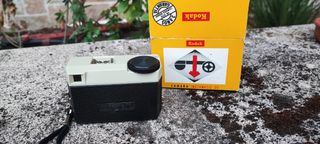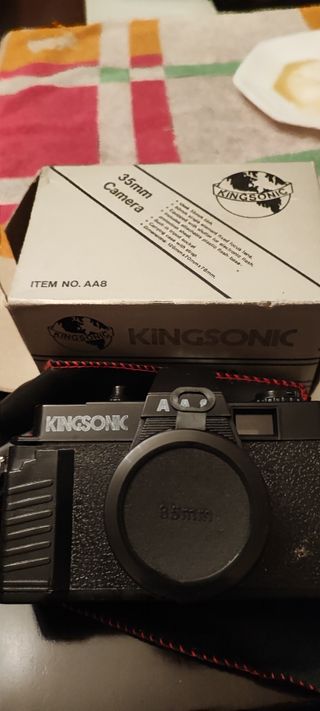 Cámara analógica Kingsonic de 35mm. - Lente de enfoque fijo de elemento simple. - Obturador para flash electrónico. - Incluye base plástica acoplable para flash. - Funda de protección. - Base para trípode incorporada. - Estuche de transporte con correa. - Dimensiones: 126mm x 70mm x 78mm.