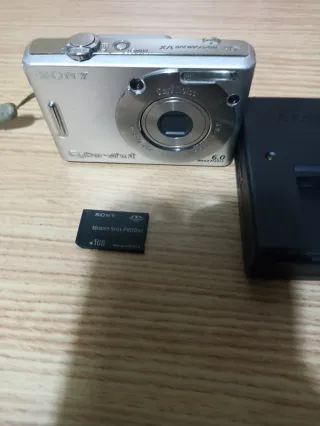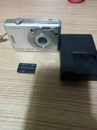 Cámara digital Sony Cyber-shot plateada con 6.0 megapíxeles. Incluye cargador y tarjeta de memoria. - Cámara compacta. - Tarjeta de memoria Memory Stick PRO Duo de 1GB. - Cargador de batería. - problema con el flash