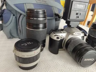Conjunto de Objetivos Canon + EOS-500. - Cámara Canon EOS-500 = 18€ - Objetivo Canon Zoom Lens EF 75-300mm = 150€ - Objetivo Canon Zoom Lens EF 17-85mm = 175€ - Objetivo Canon 28-80 EF 0.38/1.3ft = 40€ - Objetivo Canon 50mm EF 1:2.5 = 55€ - Teleconvertidor Teleplus Pro 300 = 110€ - Anillos separadores = 18€/ud. - Flash Starblitz 320BTZ = 22€ - Bolsa de transporte ACTIV = 15€ - 2 Filtro circular UV = 12€/ud Sólo venta en persona excepto si el envío es bajo responsabilidad del comprador por la delicadeza del producto. Precio menor que los elementos que ya de por sí, tienen precio de segunda mano ajustado. No separo.