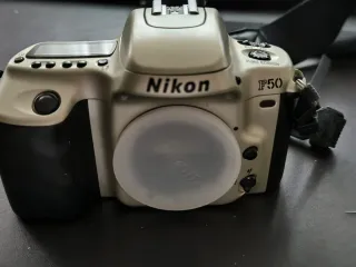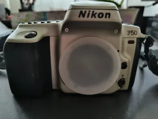 Cámara analógica Nikon F50 en color plata y negro. Incluye zoom 28-80 mm Nikkor, flash starblitz 2800 DFNi, 3 carretes, un filtro, instrucciones de uso y bolsa. - Modelo F50. - Diseño bicolor.