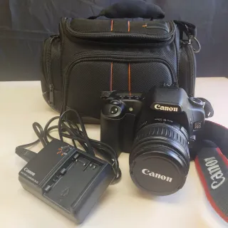 Cámara analógica Canon EOS 1000F en color negro, con dos lentes. - Lente Canon Zoom Lens EF 35-80mm 1:4-5.6. - Lente Canon Zoom Lens EF 80-200mm 1:4.5-5.6 Ultrasonic. - Incluye tapa de lente.