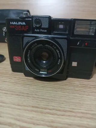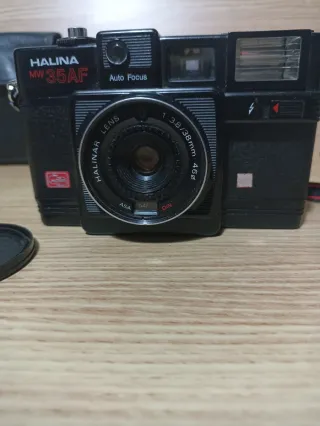 Cámara compacta Halina MW35AF con enfoque automático. - Lente Halinar 1:3.8/38mm. - Indicador de sensibilidad ISO (ASA/DIN). - Diseño clásico en color negro. - funciona todo correctamente,lo unico que no cierra bien la tapa de las pilas