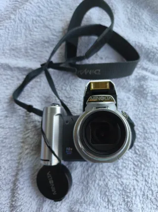 Cámara digital Minolta plateada y negra, perfecta para capturar tus momentos. - Captura fotos y graba vídeos. - Diseño compacto y fácil de usar.