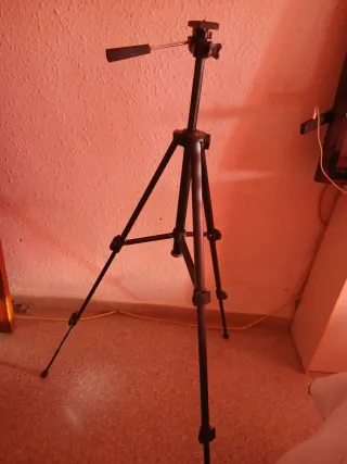 Trípode negro para cámara fotográfica o de vídeo. Es un accesorio esencial para obtener tomas estables y nítidas. - Patas ajustables en altura. - Cabezal giratorio para diferentes ángulos. - Diseño plegable para facilitar su transporte.