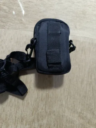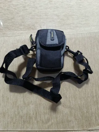 Funda de tela resistente para cámara compacta o accesorios pequeños. Cuenta con una correa ajustable para llevarla cruzada o al hombro. 12x7x6cm - Color negro y gris. - Cierre de cremallera. - Bolsillo extra - Correa ajustable.