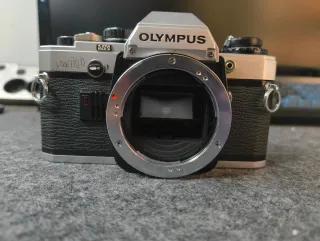 Cámara analógica Olympus OM10 en color plata y negro. Funcional y en buenas condiciones externas, salvo por un golpe. Ha sido revisada y reparada en taller especializado, sellos de luz recién cambiados Puedo enseñar video de la cámara sacando fotos Preguntar por más información