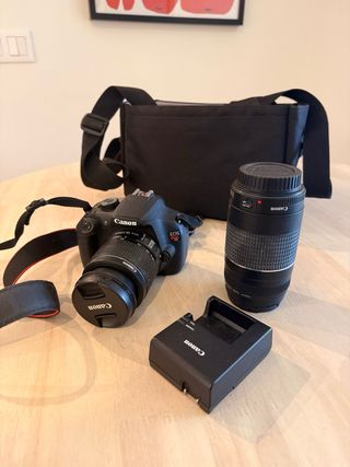 Kit de cámara Canon Rebel T5 con dos lentes y accesorios. - Cámara réflex digital. - Lente 18-55 - Lente 70-300 - Cargador de batería. - Correa para el cuello. - Bolso de transporte Una camara muy querida, pocos disparos, siempre mantenida en su bolso. Ideal para empezar y practicar, con los dos lentes permite probar gran variedad de tomas. *** Tiene un detalle en el flash que no se abre solo pero si lo ayudas con el dedo se levanta y funciona sin problemas. La verdad nunca me dio problemas.