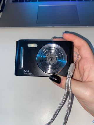 Cámara digital compacta, ideal para capturar tus momentos. Incluye su cable de carga USB. Apta para niños. - Diseño elegante en color negro. - Correa de sujeción plateada.
