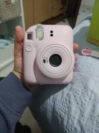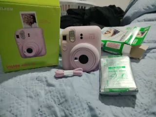 Cámara instantánea Fujifilm Instax Mini 12 en color rosa. Incluye correa y paquete de película lo que no tengo son las instrucciones. Funciona a pilas que también incluyo. - Cámara instantánea. - Correa para colgar. - Paquete de película Instax Mini de 10 fotografías. Apenas usada. La vendo porque sinceramente aunque sea una preciosidad las películas que utiliza son bastante caras . La caja tiene algún desperfecto como se ve en fotografías