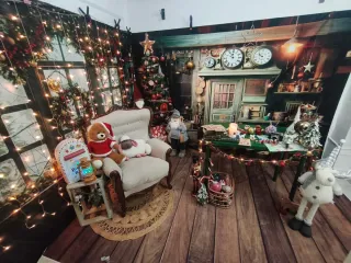 Fondo temático para sesiones de fotos navideñas. Marca Kate backdrop -Usado en la campaña navidad 2025 -Facil instalación, es de tela no se arruga fácilmente y se puede lavar y planchar. -Medidas fondo 300x200cm (tela) -Medidas suelo 300x200cm (es de vinilo) (Se vende todo junto)