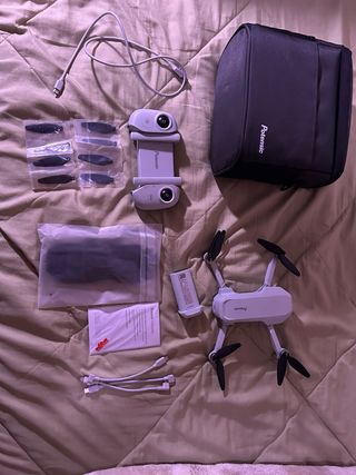Drone PRO para fotografía aérea inteligente. Diseñado para usuarios de 14 años en adelante. - Cámara HD. - Evitación de obstáculos. - Localización por flujo óptico. - Diseño plegable. - Batería modular. - Doble cambio de lente. - Giro 360°. - Modo sin cabeza. Está nuevo tiene las piezas de recambio el cable para cargar instrucciones pista de aterrizaje y demas