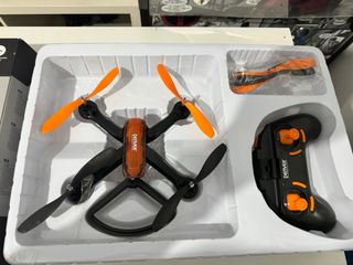 Mini dron GMRC en colores naranja y negro, ideal para iniciarse en el vuelo. - Incluye control remoto. - 3 baterías adicionales. - Estuche de transporte. - Hélices y herramientas.