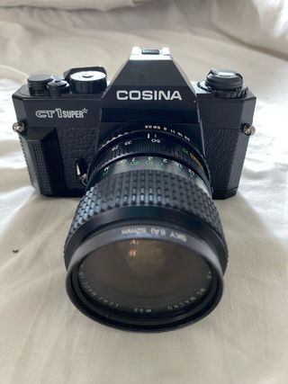 Cámara analógica Cosina CT1 Super con objetivo macro. - Cuerpo de la cámara en color negro - Objetivo Cosina Macro 70mm con aperturas de diafragma de 2.8 a 22 - Incluye tapa para el objetivo - Año aprox 1982-1985 - Montura: Pentax K (K-Mount) - Control de exposición manual - Velocidades de obturación hasta 1/1000s - Zócalo para flash (hot shoe) - Fabricación japonesa Objetivo Cosina MC Macro Zoom incluido: - Rango aproximado: 28–70mm - Apertura variable f/3.5 – f/4.5 (aprox.) - Enfoque manual - Modo Macro - Rosca de filtro 52mm