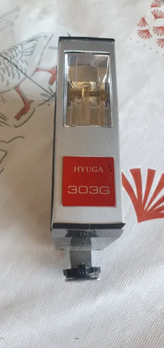 Flash Hyuga 303G para cámaras fotográficas analógicas. - Dial de configuración con escalas ASA/DIN y apertura. - Mecanismo de manivela lateral.