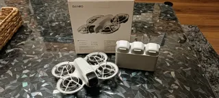 Se vende dron DJI Neo en perfecto estado, listo para volar. Incluye el mando para controlarlo, tres baterías y un cargador para las mismas. Se puede volar con el mando, con el teléfono o solo con el dron. Se incluye protector anti golpes naranja y protector para cámara y gimbal. Está en muy buen estado y con embalaje original. - Dron DJI Neo - Mando de control - 3 Baterías - Hélices de repuesto - Cable de carga y cargador para tres baterías.