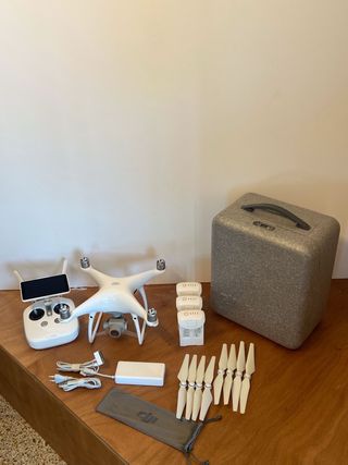 Drone DJI Phantom 4 con 2 baterías (una no carga ) en color blanco. Incluye todos los accesorios originales. - Drone DJI Phantom 4 - Mando a distancia - Cargador - Batería - Hélices de repuesto - Bolsa de transporte - Manuales y caja original