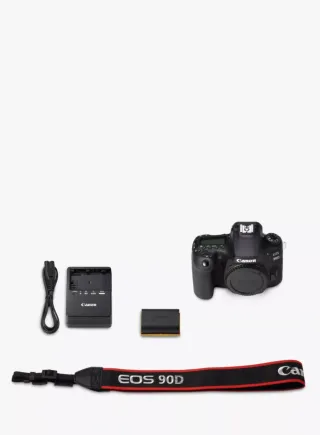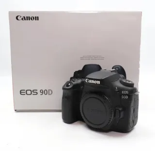 Cámara réflex digital Canon EOS 90D junto con un objetivo de 50mm. - Cuerpo de cámara en color negro. - Objetivo Canon 50mm.