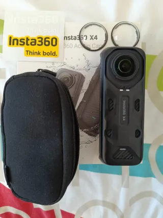 Cámara de acción Insta360 X4. - Diseño compacto y robusto. - Lentes sin roces o golpes, perfectas - protectores de lentes sin roces ni golpes - incluye protector rígido de cámara - funciona perfectamente, se ha usado 4 veces - la vendo por falta de uso, está como nueva.