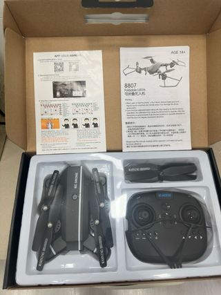 Dron plegable modelo 8807. Lo vendo porque no lo uso. - Incluye control remoto 2.4GHz. - Hélices de repuesto. - Manual de usuario.
