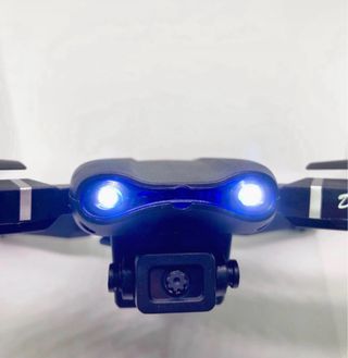 Dron plegable de color negro, con luces LED frontales azules y un diseño moderno. - Diseño plegable para fácil transporte. - Luces LED frontales azules. - Cámara frontal integrada. - Indicador luminoso superior.