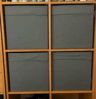 Conjunto de cajas de almacenaje DRONA de Ikea para estanteria Lack. 2 cajas de color gris y 7 de color negro. Una caja 2,5€ o las 9 por 20€.